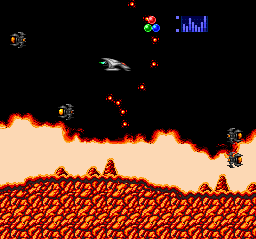 | The boss at the end of last stage tells you it's only the beginning, as you continue on to more stages that seem like re-hashes of earlier ones. Here's the fiery cave revisited, with a new boss that takes a lot of punishment. |