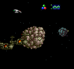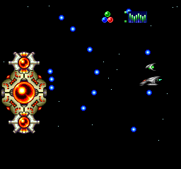 | Wow, there certainly are enough stages, aren't there? This one takes place in the stream of some large ship or comet, and the background cycles and rotates just like in the third stage. The boss is a relatively easy energy core. |