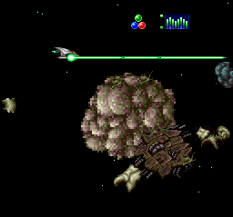 | It starts getting more intense, as debris floats around and you have to avoid some obstacles and shoot others -- power-ups mostly only appear out of the explosions of destroyed space debris. Our boss constantly scales in and rotates towards us through the course of the stage. Unfortunately, it's more software-scaled Judder-O-Vision. |