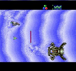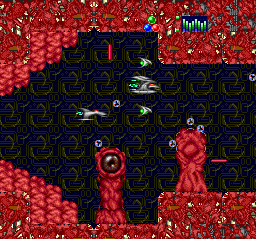| This stage starts off like stage 2, with a convoy of large ships to attack, but then you find yourself blasting your way through a huge blue mothership. You wind your way through the narrow corridors while the ship bobs and scrolls around the screen, finally ending up at the engines which you must destroy to complete the level. |