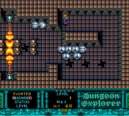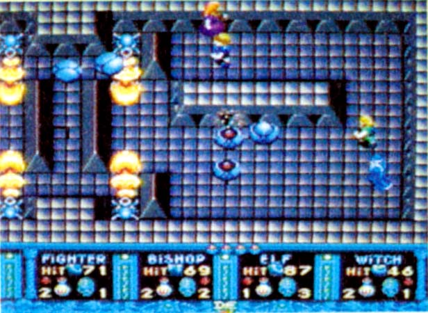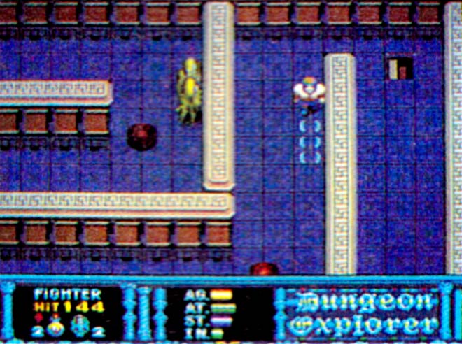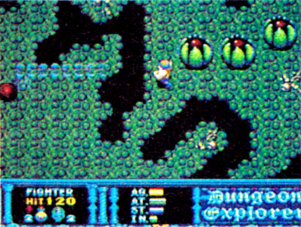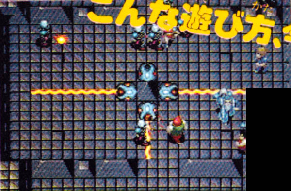 This classic PCE game had its grand unveiling at the Tokyo Toy Show in June 1988, and was slated for release in October-December of that year. In actuality, it was finally released in March of '89, delayed for some reason. (Hackers might be interested to know that the internal date of the released Dungeon Explorer ROM appears to be "10-30", October 30th, 1988 possibly.) Anyway, the earliest shown version of DE had several major differences to the final version, most notably a much larger, beefier blond Rambo-like fighter sprite. Later beta versions shrank the players but differences still exist, as can be seen below Other notes to fill up space: Some magazine screenshots show players "inside" the walls, meaning that they probably had access to the game's famous DEBDE-DEBDA debug code. However, some of the hit point gauges show invalid characters instead of numbers, so this display must have been fixed up during development. Another thing I wanted to note is the sheer darkness of the game's graphics. I've brightened them up considerably in the final screenshots so that they're not a murky mess. Speaking of graphics, the artist for the title screen and "landscape" introduction seems to be a different person from the in-game artist, don't you think? The title frame and landscapes are all dithered and grainy, while in-game almost everything has a metallic sheen. The title frame reminded me of the intro graphics in Bio Senshi Dan, another game Atlus worked on. (Oh, and PC Genjin's ditheriness as well...) |