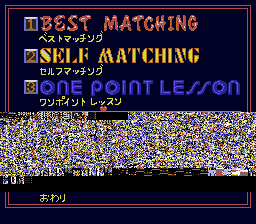 The first option says BEST MATCHING. Likely prior to running an elaborate search, the ALN software asks you for your personal details, then saves your answers in the PCE-CD's backup RAM. Using it, this option will probably have the ALN software find the best match for a marriage partner for you. Along with a 112x192-pixel greyscale image of the selected partner, the ALN software displays their relevant personal statistics over about 4 screens of text.