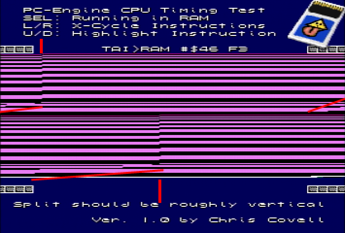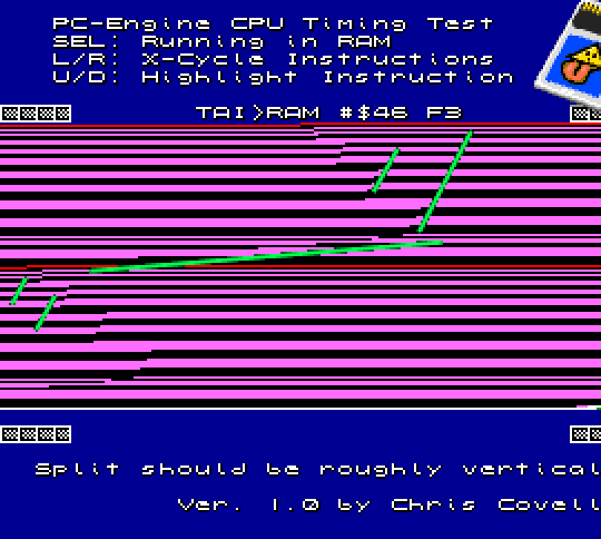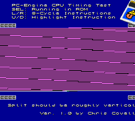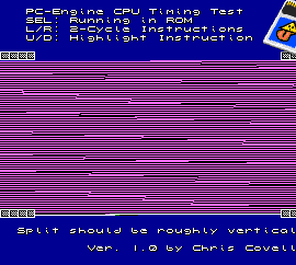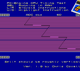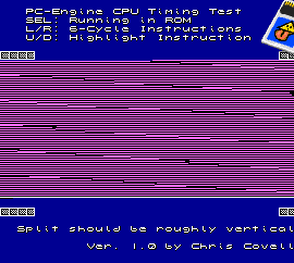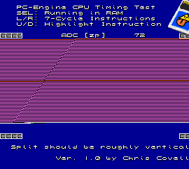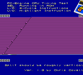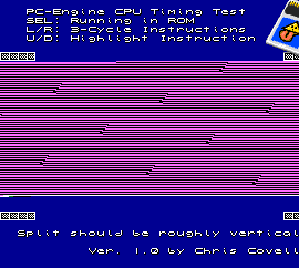 This is a ROM to test CPU cycle accuracy in emulators & FPGA hardware targeted at the PC-Engine / TurboGrafx-16 game system. It is a visual test, so really it's comparing the CPU timing against correct emulation of the VDC & VCE video chips. In the test, each scanline "starts" with a change in the background colour, and then a single CPU instruction is looped over many times until the CRT beam wraps around and reaches the same spot one line below. I've put all 2-cycle opcodes to be tested together on one screen; all 3-cycle opcodes on another, and so on. Thus, correct timing for (almost) every instruction can be quickly checked as the start- and end-points should line up vertically, minus the odd 1-cycle correction here and there. If the raster split carries down the screen at an angle, then the cycle timing is incorrectly emulated. If the angle heads down and to the left, then somehow the CPU is being emulated too fast. If the angle heads down and to the right, then CPU emulation is too slow. These cycle-timed CPU opcodes can be run either from ROM or RAM. When they are running in RAM, each instruction can be highlighted in the raster display if you press up or down. This can help to single out which instructions are running too fast or slow. If a single instruction's scanline clearly doesn't reach back on itself, then CPU emulation is too fast. If the same coloured scanline wildly overlaps with itself from above, then CPU emulation is too slow. |