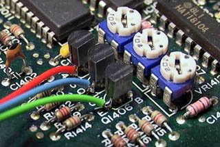 The PPU is a nice, professional-looking chip to the right of the normal NES CPU. It outputs RGB video, which goes down to a triplet of variable resistors for colour mixing. Then to some transistors for amplification (?). |
