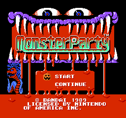 Here are some early screens of the unreleased (in Japan) Monster Party. Its early title, as found in October 1988 Famicom Hissyoubon and Famimaga issues, is "Parody World Monster Party". ** A late prototype of the Japanese Monster Party has finally been released as a ROM! Please look for it, eh? **