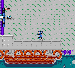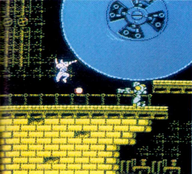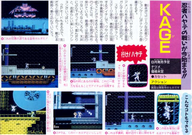 Famimaga reported on Kage in April, 1990. The game had progressed and now looked much closer to the final version, barring the old intro graphics and thin, Mega-Man-like units for the health bar. The characters now attacked with their katana and kusarigama, not their feet like the earlier version. |