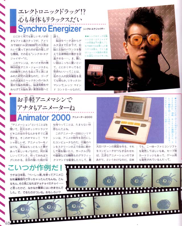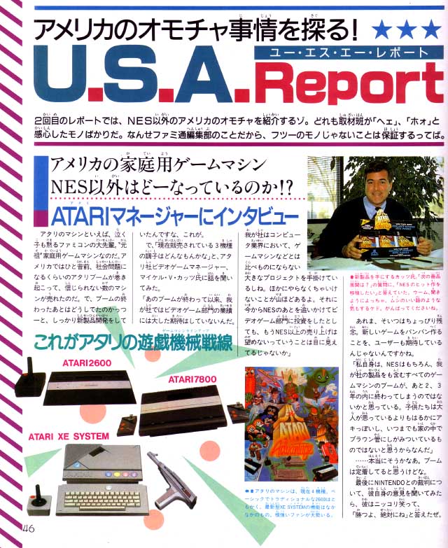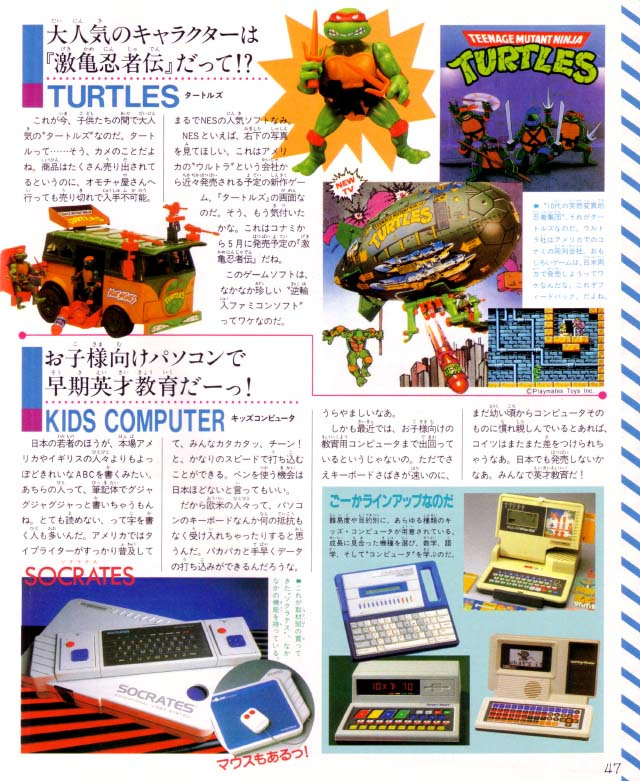 Famicom Tsushin reported in their March 17, 1989 issue on a U.S. toy show. While NES games undoubtedly made an appearance, Famitsu reported on everything else left in Nintendo's wake: Atari and (regular) toys. Remember these? Seen here are TMNT figures, a nostalgic but useless item, the Animator 2000, and various "learning computers" like the Socrates and other crap-tops.