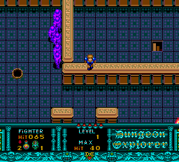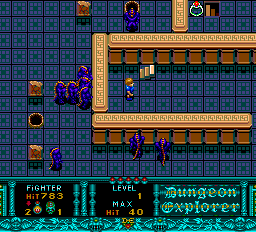 This classic PCE game had its grand unveiling at the Tokyo Toy Show in June 1988, and was slated for release in October-December of that year. In actuality, it was finally released in March of '89, delayed for some reason. (Hackers might be interested to know that the internal date of the released Dungeon Explorer ROM appears to be "10-30", October 30th, 1988 possibly.) Anyway, the earliest shown version of DE had several major differences to the final version, most notably a much larger, beefier blond Rambo-like fighter sprite. Later beta versions shrank the players but differences still exist, as can be seen below Other notes to fill up space: Some magazine screenshots show players "inside" the walls, meaning that they probably had access to the game's famous DEBDE-DEBDA debug code. However, some of the hit point gauges show invalid characters instead of numbers, so this display must have been fixed up during development. Another thing I wanted to note is the sheer darkness of the game's graphics. I've brightened them up considerably in the final screenshots so that they're not a murky mess. Speaking of graphics, the artist for the title screen and "landscape" introduction seems to be a different person from the in-game artist, don't you think? The title frame and landscapes are all dithered and grainy, while in-game almost everything has a metallic sheen. The title frame reminded me of the intro graphics in Bio Senshi Dan, another game Atlus worked on. (Oh, and PC Genjin's ditheriness as well...) |
