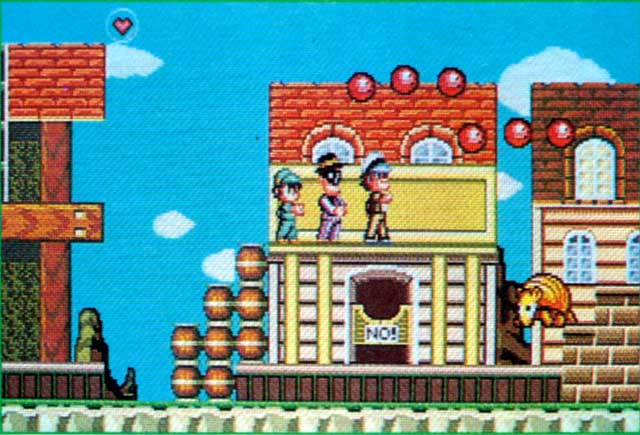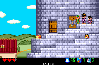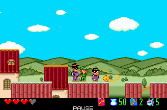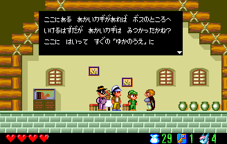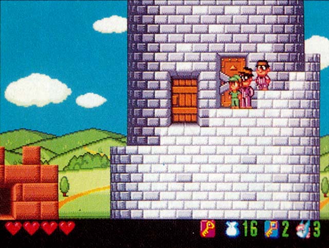 Below, we can see a background that was removed entirely from the final version. I don't think the mountain backdrop of the beta appears at all in the final. Bottom: This caped man's hint to the team is slightly different. In the final, he says "The key is above the ceiling." In the beta, he's more cryptic: "I've heard it's in an unseen place." |