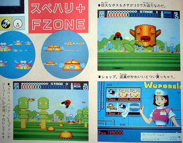 Here is the infamous Space Fantasy Zone, for the PC-Engine CD. It was never released officially, of course, but you can find bootleg versions of this great game on the 'net. What we can see here is an even earlier version. The "Weaponald's" shop is different from later versions, for example.