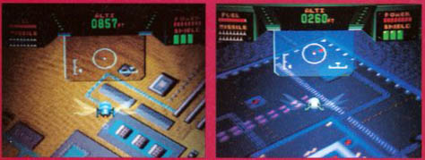 | Since the two leading Famicom magazines of the day, Famimaga and Famitsu, each published almost a dozen pictures of the games demonstrated here, I thought I'd put similar photos side-by-side to give readers a better chance to pick out details in the game itself. Unfortunately, these shots are rather small and indistinct in both magazines. As they were too dim, faded, or blurry even on paper, I had to do a lot of colour adjustment to bring out the details of the underlying game screens. I did minimal descreening so as to minimize extra blurring during my scanning process. Well anyway, I hope you can make out enough detail to fire the imagination as to what these games could have been. My comments: Wow! Now, while the eventual Pilotwings was a real technical showcase for the Super Famicom, this early version called Dragonfly looks to have been an attempt to make an actual action game out of the Mode 7 flight simulator. Taking off from a helipad on a cruising ship, hovering like a dragonfly, and zipping up above the clouds, the game appears similar in concept to Atari's Blue Lightning or Namco's Metal Hawk. First off, a digital mock-up I made giving you a good idea of what the game would look like on a clear screen: |