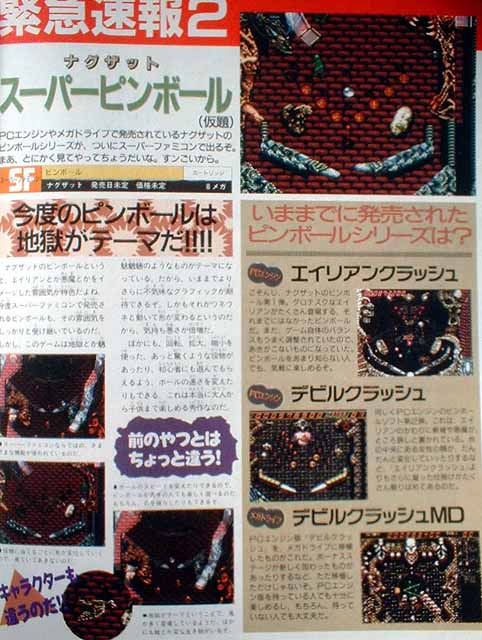 Here's a preview of Naxat Super Pinball on the SFC, the follow up to the great Crush series on the PCE. It eventually came out as Jaki Crush, and was good but not great.