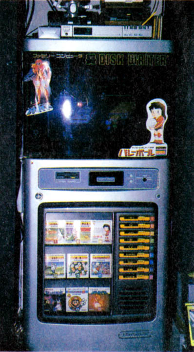 Here are the insides of a Nintendo-franchised game shop, circa 1991. Of course, the uniform displays, signage, game placement, and pricing are all dictated by Nintendo. In return for forfeiting all autonomy, the game shops receive at least 10 times the amount of stock of the most popular games, compared to what independent game shops got. Anyway, check out the huge stack of yellow "NES" cartridges in the picture to the right. Those are the permanent ROM masters of FDS games that the Disk Writer unit reads to write to FDS media. Nintendo certainly reused their hardware and plastic moulds whenever possible... |