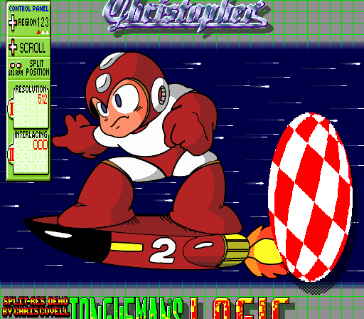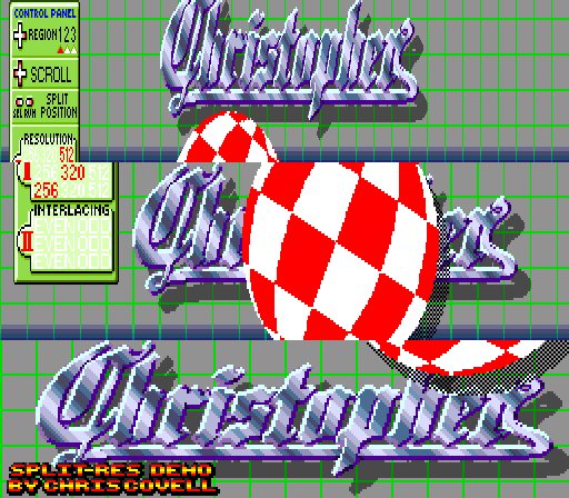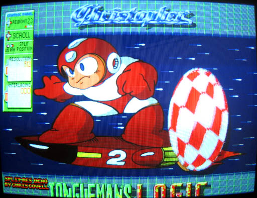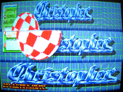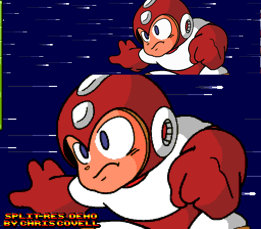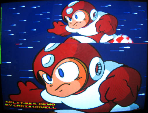 This page shows some images of what the split-resolution demo might look like in an emulator that could switch resolutions mid-frame, and what it actually looks like while running on a PC-Engine system. I just took some photographs of my video monitor connected to the PC-Engine.