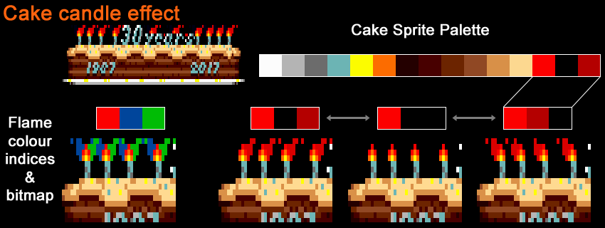The flames of the candles flicker and waver as the cake moves back and forth, as though disturbed by turbulence (...in... the void of space) and the animation of this effect was accomplished by a trick that's as old as video games themselves. As can be seen below, I reserved two colour indices in the cake palette to use for each direction that the flame leans in. When the cake is decelerating at the vertex of its movement, both indices are black and the candle flame appears to be still. At other times, only one of the indices is painted red, illuminating the flame against the direction the cake is travelling.