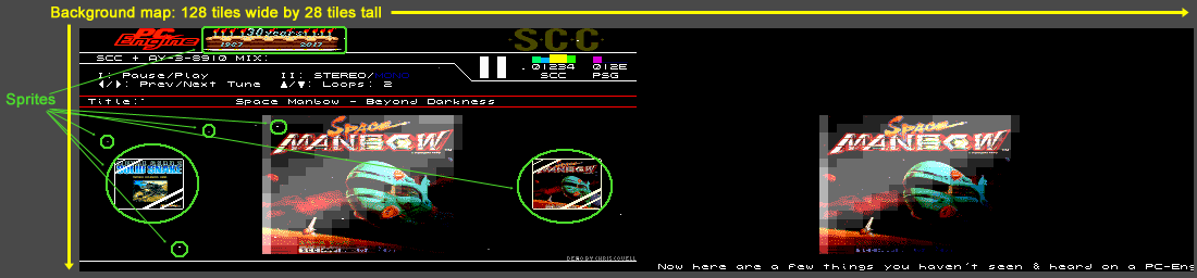 Several people have asked that I explain some of the music or graphic techniques that I used in my demo. I'm a bit surprised, but I guess the demoscene and retro console (homebrew) scene don't overlap as much as I had thought, so knowledge of what the PCE can and cannot do is not widespread enough yet.