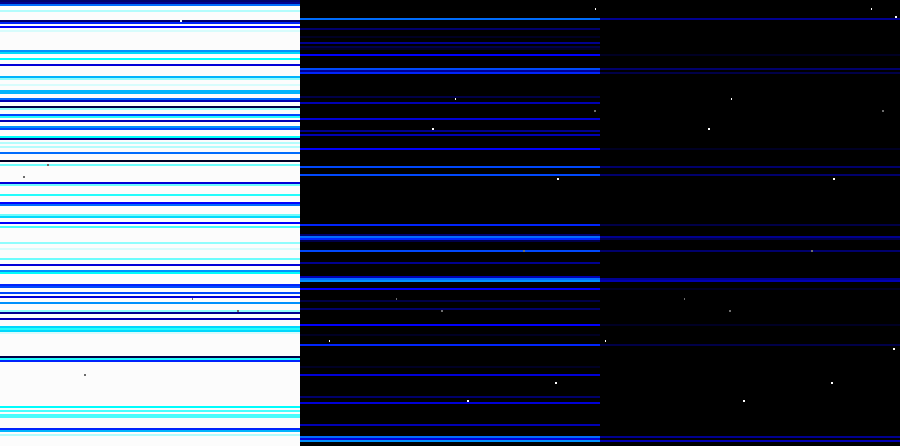 Between my "Tongueman / C.COVELL" logo, which is in low-resolution (256 pixels across), and my main demo screen, I had wanted a somewhat smooth transition. So I decided to make an effect where scanlines fade progressively from white through to blue and then to black, in random order. It is, again, a rather simple effect. First, right as the Tongueman logo disappears by clearing the top half of the BG map, I change resolutions to 512 pixels across, and write the initial table of star positions into sprite RAM and start them scrolling. I then set up an HSync interrupt routine on each scanline that reads a colour value (or just a simple index) for the corresponding scanline from a table in RAM. This table starts out with all colour values set to 21 (white). My main code then reads (on each VBlank) a successive value from a table of random numbers from 0 to 223, and decrements the colour value in the scanline table indexed by that random number. <breathe>