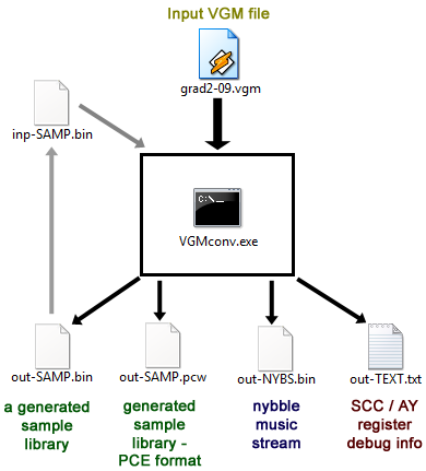 So, I started writing a program in C to parse a VGM file and write out a much shorter, more optimized custom file that my PCE demo would use. At this point an Information Theory guru would probably come in and call for automated binary Huffman coding of the VGM command stream. And, in a sense, that's sorta what I did. However, to keep things somewhat human readable (one of my goals, in case a sound or timing or loop point needed, for some reason, human tweaking) I have made the granularity of most commands nybble-based, that is, a stream of 4 bits at a time.