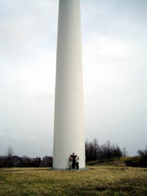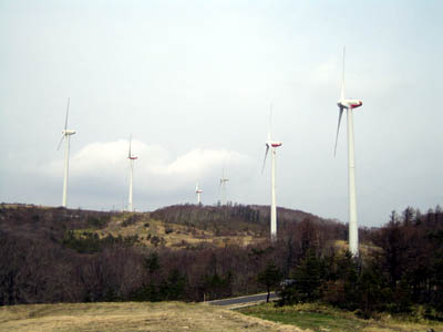 massive wind-powered generators slowly whirring around. |